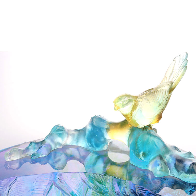 De fruitschaal is bovendien versierd met levensechte glazen vogels en andere glazen voorwerpen, waardoor de hele fruitschaal een vleugje speelsheid en behendigheid krijgt. Wanneer felrode druiven en ronde appels erin worden geplaatst, vullen de heldere kleuren van het fruit en de koele tonen van de glasplaat elkaar aan, waardoor een visueel harmonieuze schoonheid ontstaat.